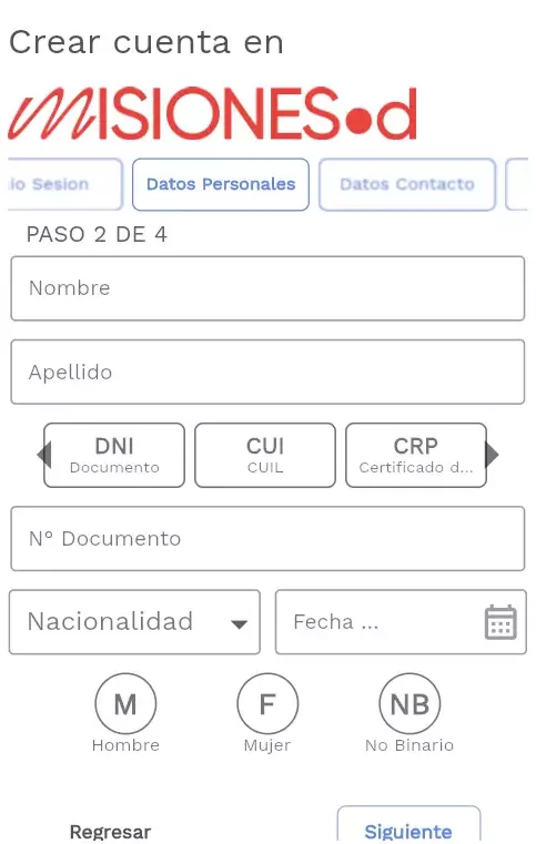 En esta pantalla deberá ingresar todos sus nombres, su apellido, el tipo y número de documento, su nacionalidad, fecha de nacimiento y el género que figura en el documento.