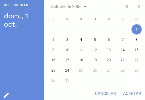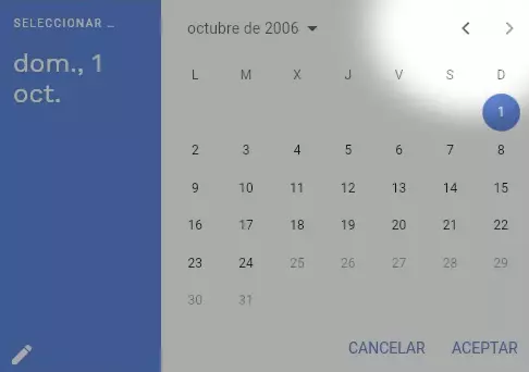En las siguientes imágenes se muestra donde puede hacer clic para cambiar el año y el mes. Luego queda seleccionar el dia y apretar donde dice Aceptar