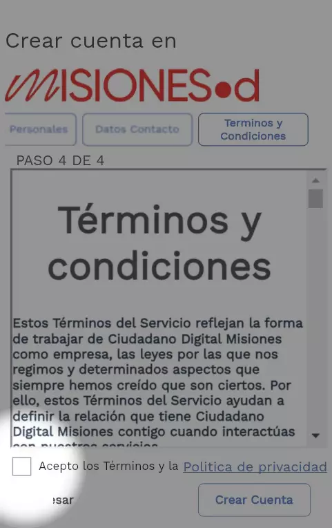 Para continuar con el proceso de Crear Cuenta debe marcar el casillero para aceptar los Terminos y Condiciones. Una vez marcado se habilitara el botón Crear Cuenta